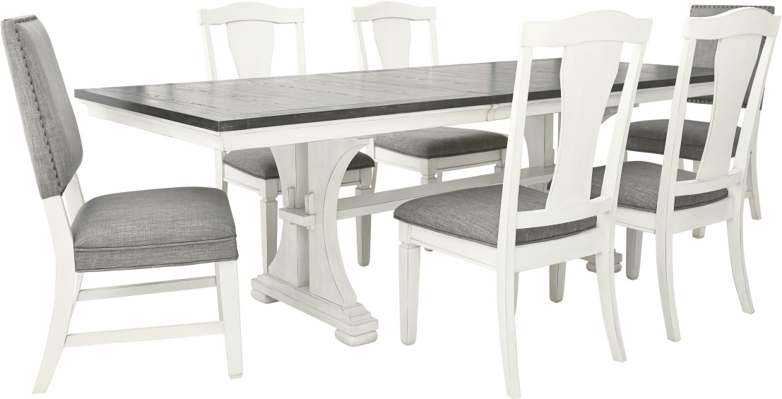Transitional styling with a European cottage design. Made with veneers and select hardwood solids in a distressed whitewashed finish. Stylish trestle base design with sturdy stretcher. Top features oak veneer finished with a dark brown stain with weathered gray grain texture. Metal equalizing table slides for easy function. Upholstered back dining chair with quilted velvety gray fabric and nail head trim. Splat back side chair with heavy woven polyester fabric with a blended mix of gray colors.