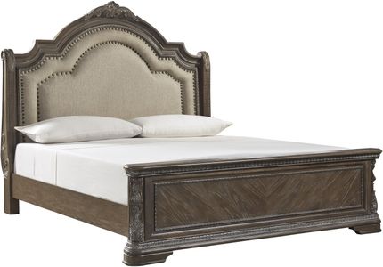 Bring ornate style and elegance to your home with this upholstered panel bed in a queen size. Panel sports a nail-head trim and intricate wood carvings for aesthetic appeal.