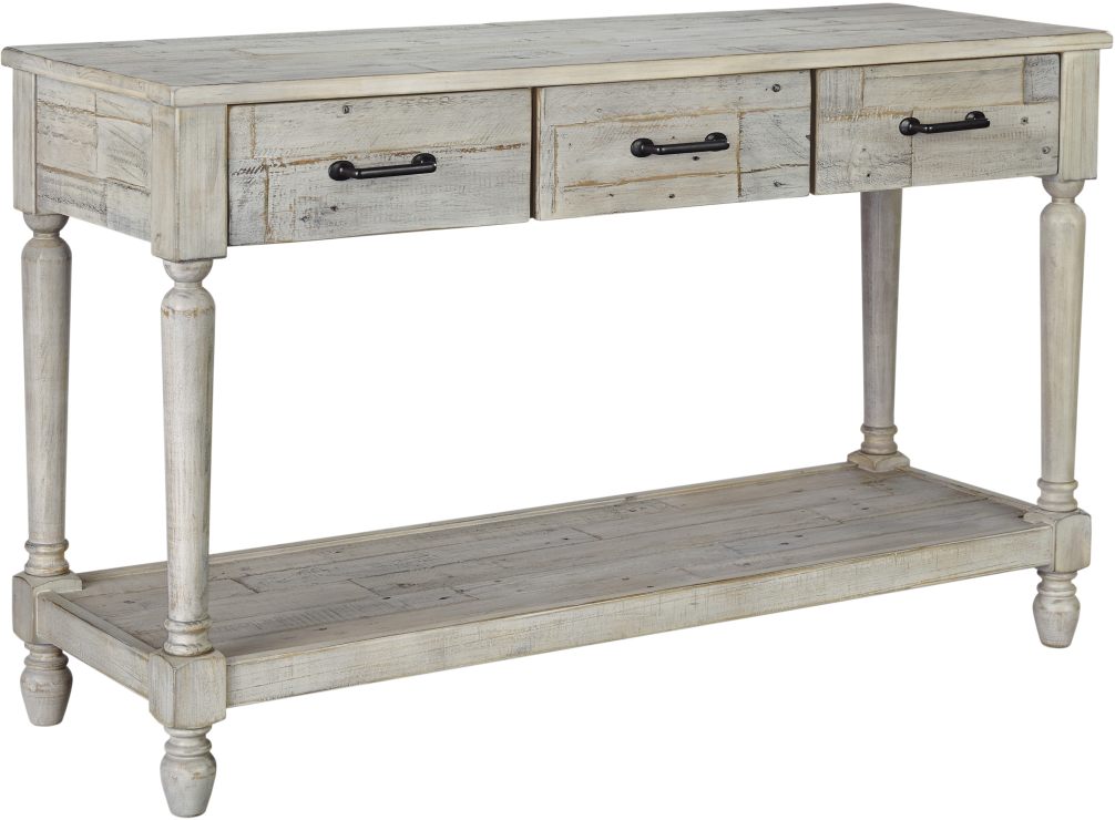 The Shawnalore sofa table features 3 smooth-gliding drawers, and open lower shelf, and a distressed whitewash finish over a planked build.